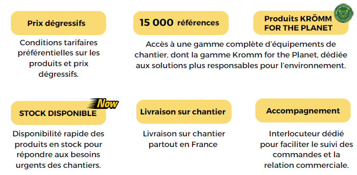 Grâce à une forte disponibilité produit, une logistique réactive et une connaissance fine des besoins terrain, Krömm accompagne au quotidien les entreprises de construction, les collectivités et les acteurs des travaux publics partout en France